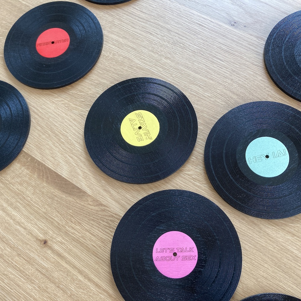 Dřevěný podtácek v podobě vinylové desky, na kterou vám do barevného středu vygravírujeme vaší oblíbenou skladbu, nebo kapelu.