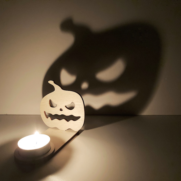Halloweenské stínítko s motivem dýně. Čím dále od zdi stínítko umístíte, tím bude stín na zdi větší. Dodáváme včetně stojánku s pouzdrem na čajovou svíčku.