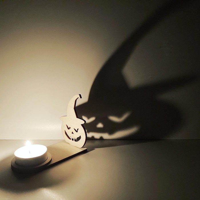 Halloweenské stínítko s motivem dýně. Čím dále od zdi stínítko umístíte, tím bude stín na zdi větší. Dodáváme včetně stojánku s pouzdrem na čajovou svíčku.