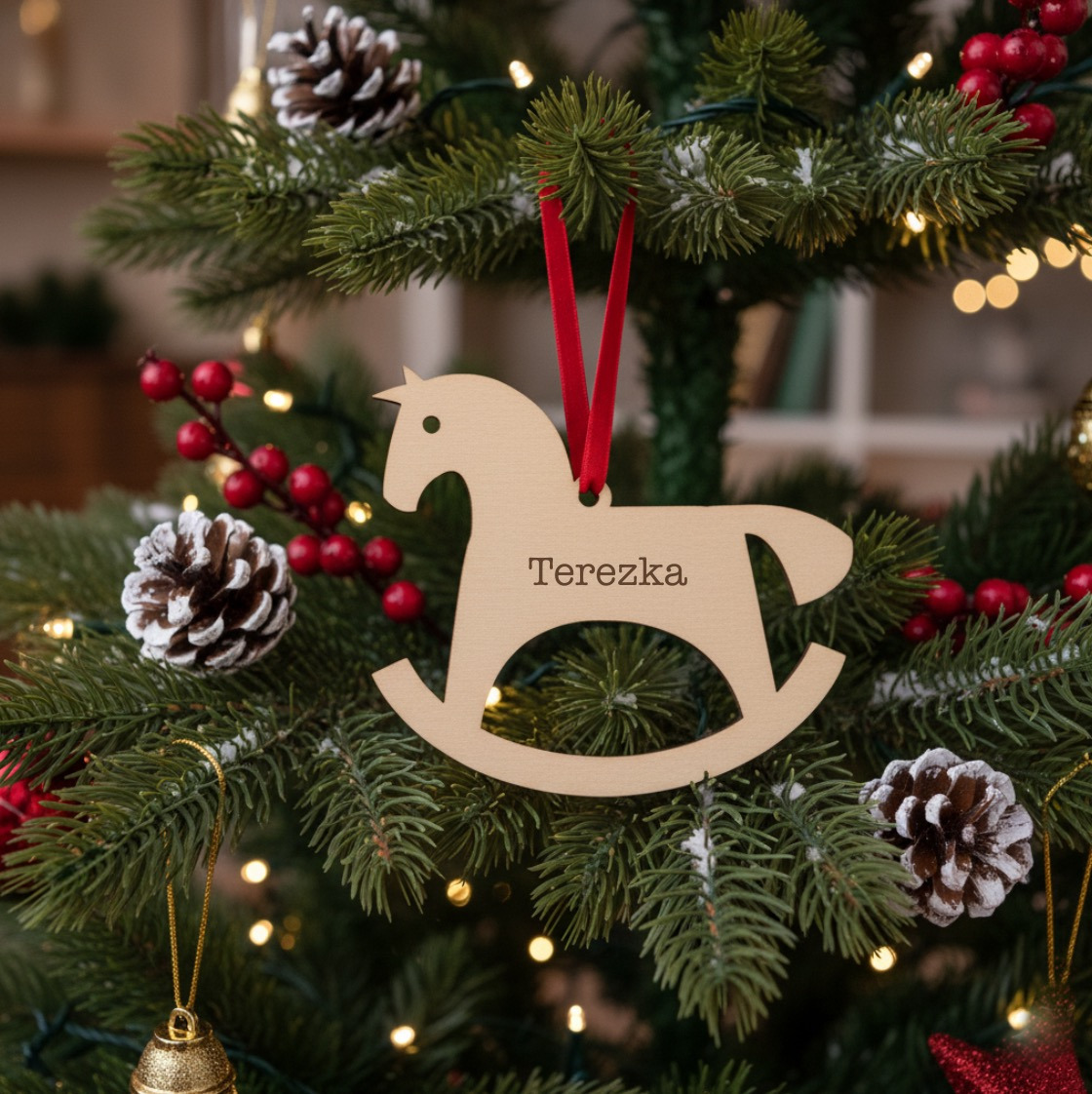 Oživte své vánoční dekorace s jedinečným houpacím koníkem, který můžete personalizovat jménem na přání! Tento krásně vyřezávaný dřevěný ornament přináší osobní dotek do vašeho domova a je ideálním dárkem pro blízké.