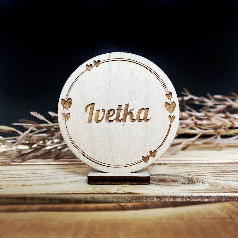 Dřevěné jmenovky na podstavci ke svatebnímu stolu.