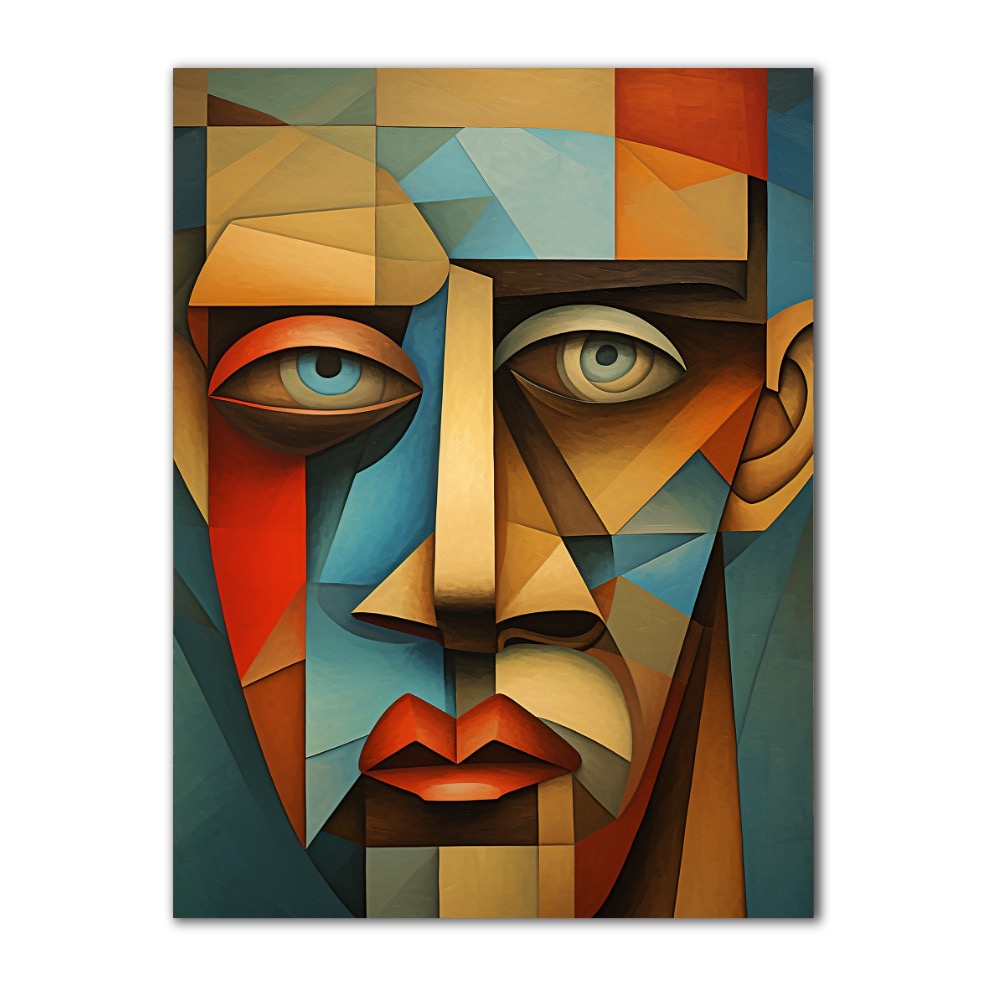Kubistický portrét mužské tváře pracuje s ostrými liniemi a segmentovanou kompozicí, která vytváří hloubku a dynamiku. Dominantní oči, výrazný nos a rty jsou záměrně stylizované do geometrických ploch, takže obraz vypadá pokaždé trochu jinak podle světla a úhlu pohledu. Barevnost stojí na modré a tyrkysové, doplněné oranžovou, hnědou a červenou – výsledkem je moderní, energický motiv, který prostor vizuálně „nakopne“.