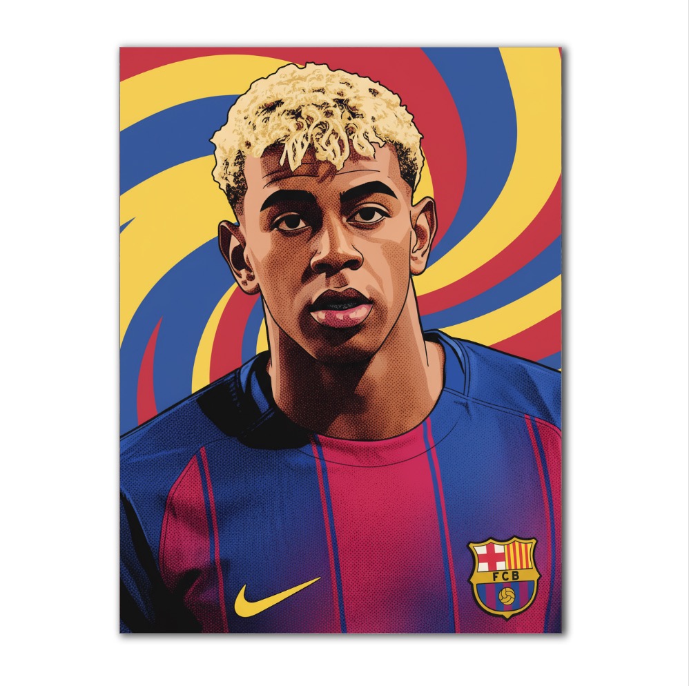Objevte jedinečný umělecký portrét mladé hvězdy FC Barcelona, Lamine Yamala! Tento stylizovaný obraz zachycuje talentovaného fotbalistu v oficiálním klubovém dresu, s výraznými barvami a logem slavného klubu. Dynamické pozadí tvoří vířící pruhy v tradičních barvách Barcelony – modré, červené a žluté – které dodávají obrazu energii a vizuální působivost.