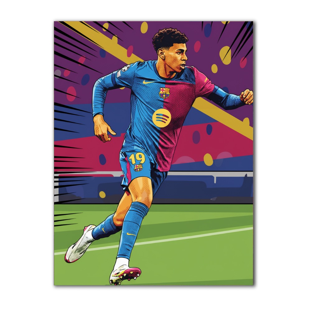 Moderní obraz s motivem vycházející hvězdy FC Barcelona, Lamine Yamala! Ilustrace v komiksovém stylu zachycuje mladého útočníka v typickém dresu Barcelony s číslem 19 uprostřed akčního pohybu na hřišti. Živé barvy, kontrastní grafika a stylové, hravé pozadí s komiksovými prvky dodávají obrazu dynamiku a energii slavného stadionu.