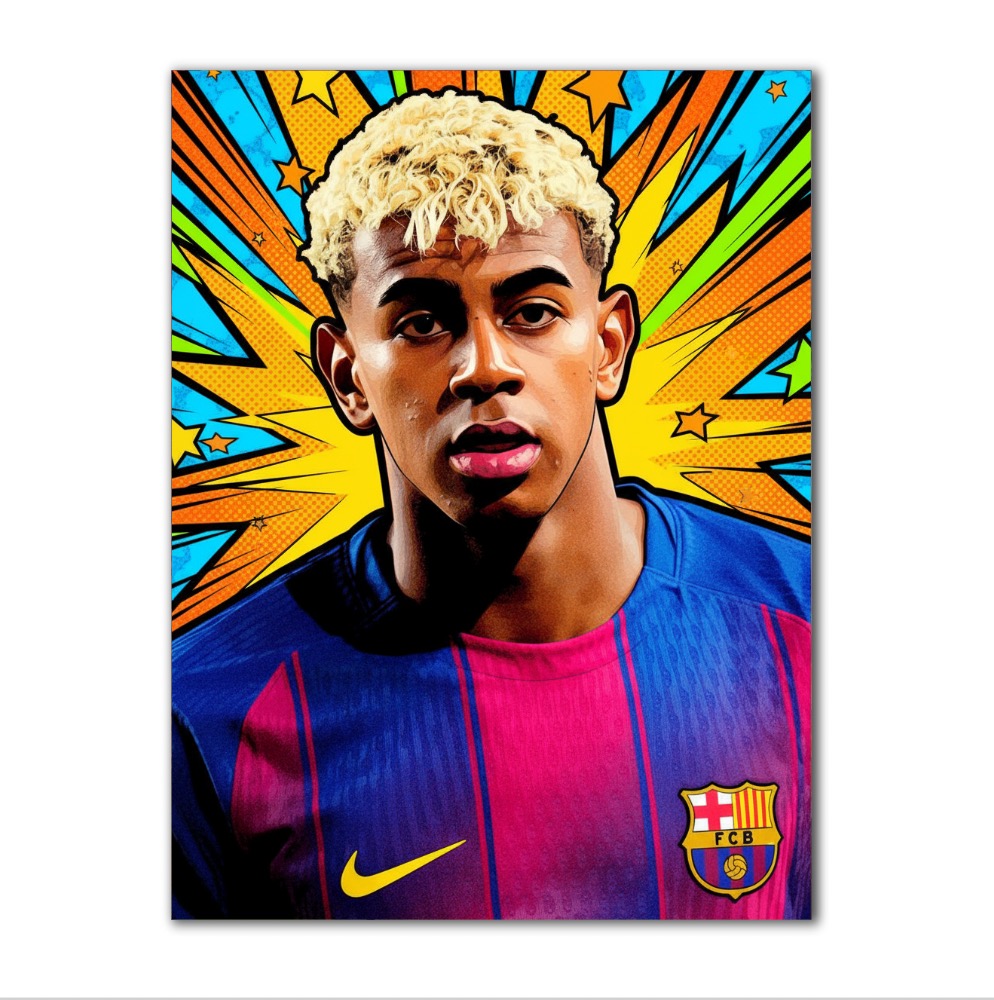 Oživte svůj interiér stylovým pop-art plakátem Lamine Yamala, talentovaného útočníka FC Barcelona! Tento poutavý portrét vyniká výrazným grafickým zpracováním, dynamickými barvami a hravým komiksovým pozadím plným hvězd a energických linií. Lamine Yamal je ztvárněn v ikonickém dresu Barcelony s klubovým znakem a typickou žlutou fajfkou.