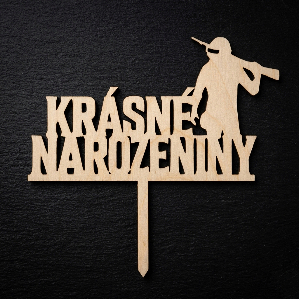 Originální narozeninová dekorace, se kterou dort hned získá výrazný „vojenský“ styl. Oceníte výrazný nápis KRÁSNÉ NAROZENINY a siluetu vojáka, která vypadá skvěle na fotkách. Zápich se hodí jako rychlé a efektní doladění oslavy bez složité přípravy.