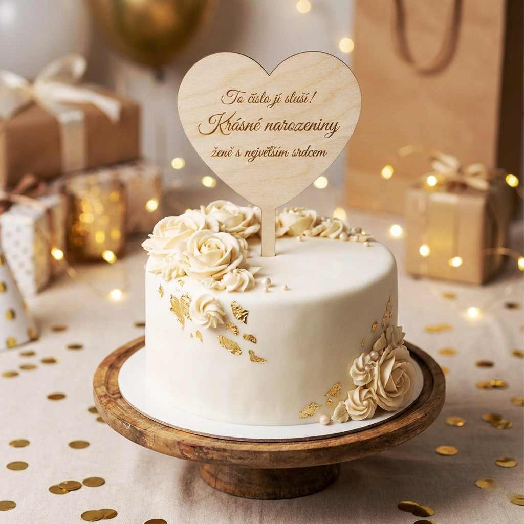Narozeninový zápich ve tvaru srdce s gravírovaným textem je stylová dekorace na dort, která dodá oslavě osobní atmosféru. Zápich je navržen tak, aby na dortu působil čistě, elegantně a zároveň přirozeně díky dřevěnému vzhledu. Na fotografii je vidět gravírovaný text ve slavnostním stylu (např. „To číslo jí sluší! Krásné narozeniny ženě s největším srdcem“).
