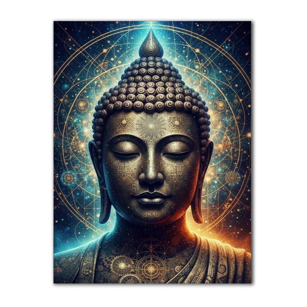Obraz "Světelný Buddha" představuje majestátní postavu Buddhy s detailním zlatým designem. Pozadí je tvořeno fascinujícími kosmickými prvky, které zdůrazňují mystiku a duchovní hloubku. Kombinace teplých a studených barev vytváří vyváženou harmonii, která osloví každého, kdo hledá inspiraci a klid.