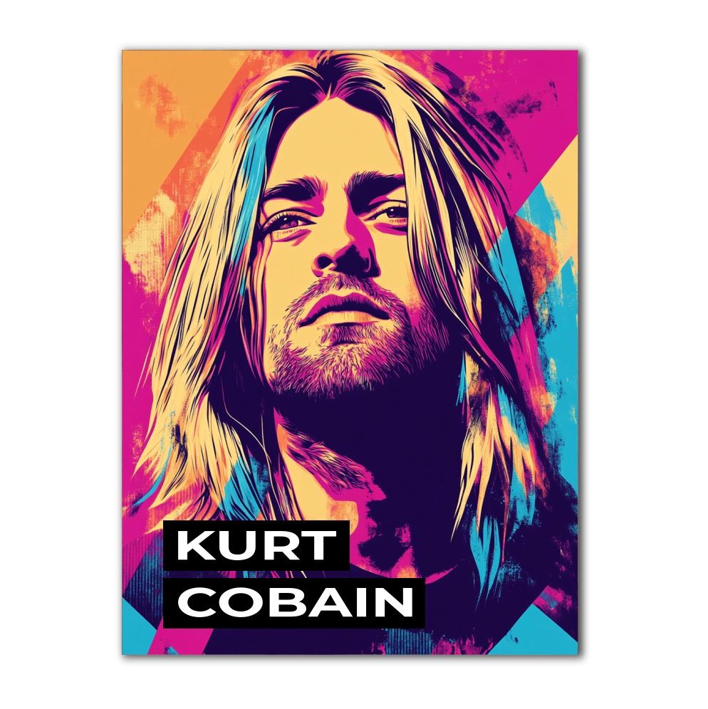 Pop-artový portrét Kurta Cobaina ztělesňuje energii a syrovou emocionalitu ikony grunge. Výrazné a kontrastní barvy – zářivé odstíny růžové, modré, fialové a žluté – vytvářejí silný vizuální dojem a připomínají intenzivní atmosféru 90. let. Kurtův charakteristický zamyšlený pohled a jeho dlouhé vlasy dodávají obrazu ikonický status, zatímco moderní geometrické tvary a textury posilují dojem dynamiky. Tento obraz je poctou nejen umělci, ale také celé generaci, která byla formována jeho hudbou a stylem.