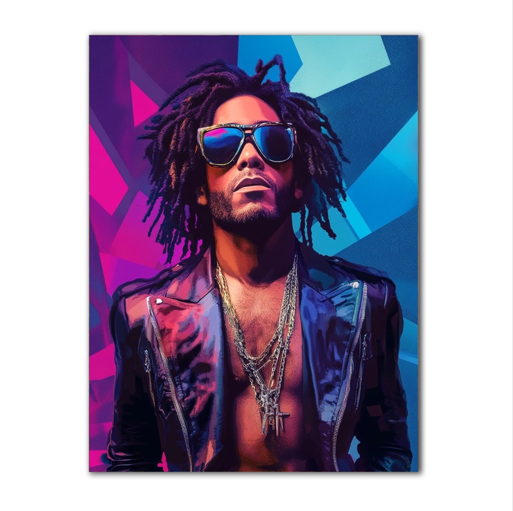 Obraz zachycuje ikonického hudebníka Lennyho Kravitze v jeho charakteristickém stylu – se silným výrazem a v odvážném oblečení, které zahrnuje koženou bundu a jeho charakteristické vrstvené šperky. Lenny je známý svou kombinací rockového, funkového a soulového vlivu, což se odráží i v jeho vizuálním stylu. Na tomto obrazu vystupuje s výraznými slunečními brýlemi a volně padajícími dredy, které dodávají obrazu energii a autenticitu.