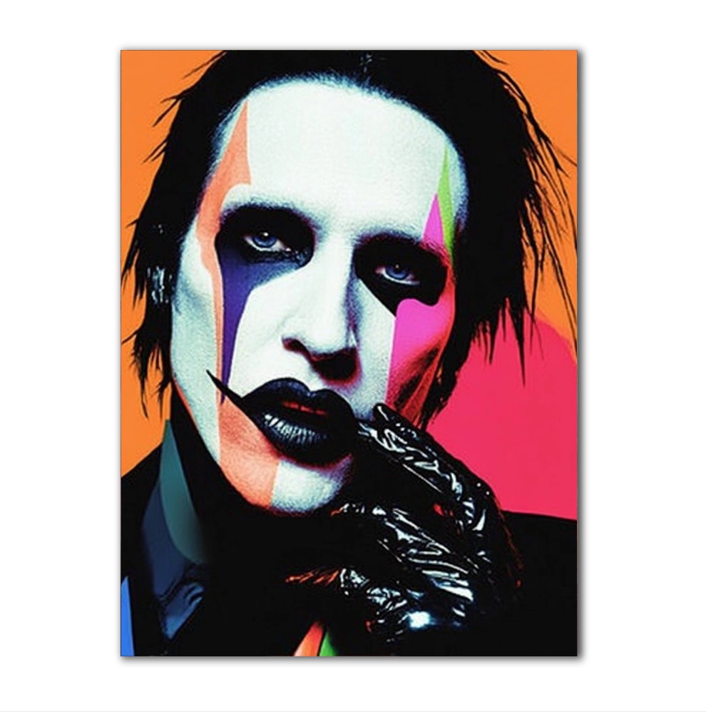 Na tomto obrazu je zachycen ve své ikonické póze s rukou poblíž úst, což dodává jeho vzhledu tajemnost a intenzitu. Tento umělecký portrét využívá pestré barvy na pozadí, které kontrastují s jeho gotickým vzhledem, což zdůrazňuje Mansonovu jedinečnou estetiku, jež oslovila jeho fanoušky napříč hudebním a vizuálním uměním.