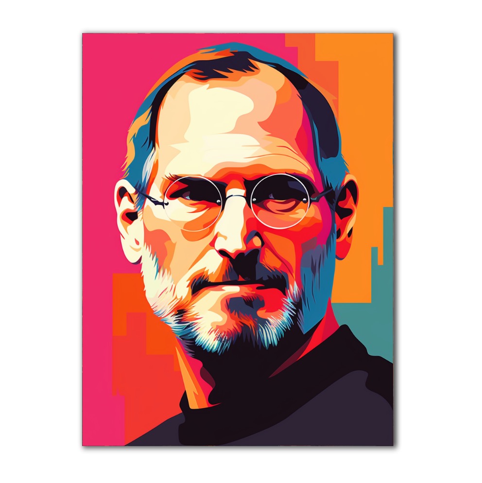 Tento obraz zachycuje ikonu moderního technologického světa, Stevea Jobse, jehož vize a inovace změnily způsob, jakým dnes žijeme a pracujeme. Portrét je vytvořen v pop-art stylu s jasnými, živými barvami, které zdůrazňují nejen jeho osobnost, ale i jeho revoluční myšlení. Jobsův pronikavý pohled, zvýrazněný kulatými brýlemi, působí hluboce soustředěně, jako by právě přemýšlel o další zásadní inovaci, která změní svět.