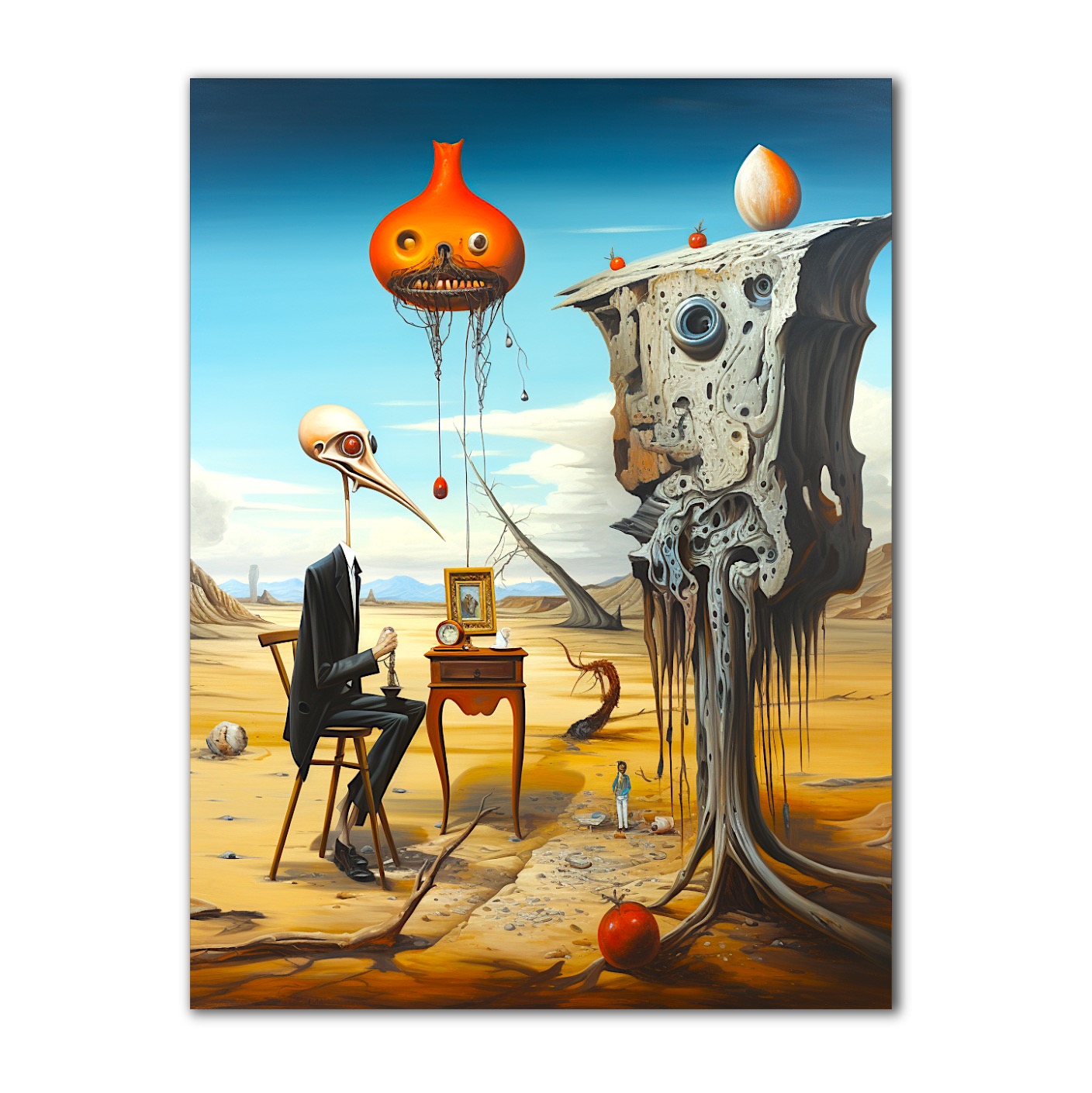 Objevte fascinující svět surrealismu s tímto jedinečným obrazem, který vás přenese do podivuhodné krajiny snů a absurdit. V popředí vás přivítá tajemná postava s ptačí hlavou, která v sobě mísí prvky reality a fantazie. Nad její hlavou se vznáší bizarní létající objekt, zatímco vedle ní se tyčí zvláštní, organická struktura připomínající zkamenělý strom nebo skálu s očima. Každý detail tohoto obrazu vypráví svůj vlastní příběh, ale zároveň vás zanechá v hluboké nejistotě, co je skutečné a co ne.