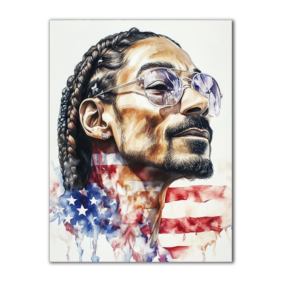 Tento unikátní portrét zachycuje legendárního rappera Snoop Dogga v nezaměnitelném stylu, který kombinuje moderní umění s americkým patriotismem. S precizním důrazem na detaily, kde se prolíná Snoopova charismatická osobnost s motivem americké vlajky, se jedná o nepřehlédnutelné umělecké dílo. Tento obraz je perfektní pro každého, kdo ocení ikony hip hopové kultury a chce přidat svému interiéru cool a moderní nádech.