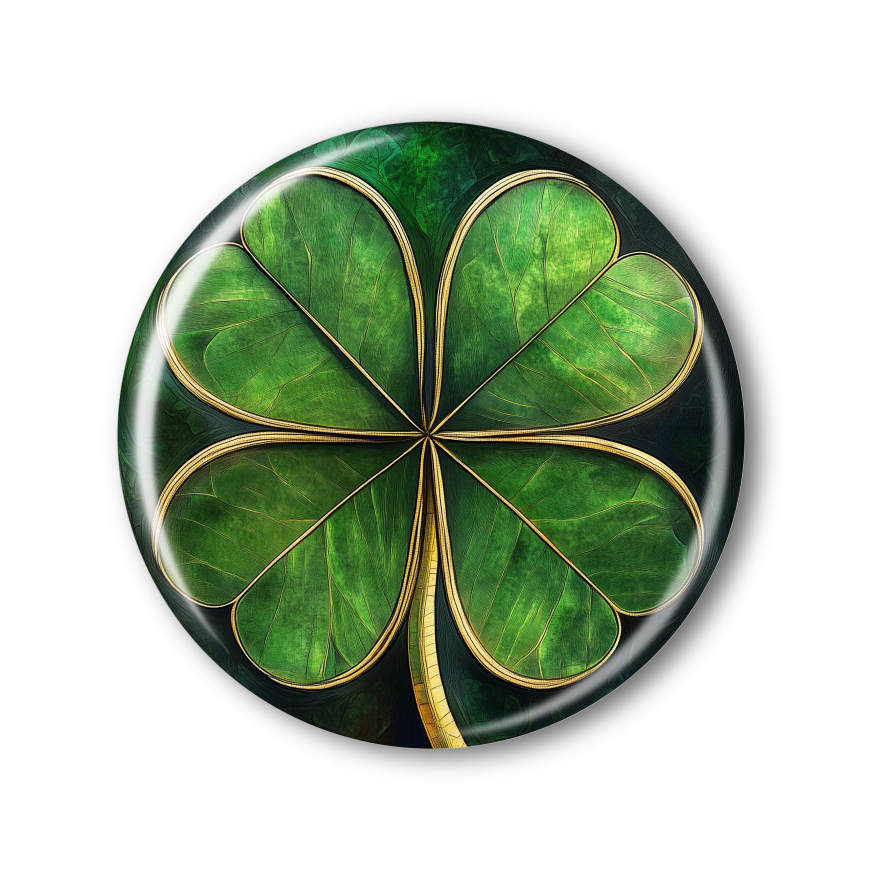Připínací placka s motivem čtyřlístku je stylovým doplňkem, který zaujme svou detailní grafikou a symbolikou štěstí. Návrh zobrazuje krásný čtyřlístek s jemnými žilkami a sytě zelenou barvou na tmavším pozadí, což vytváří výrazný kontrast. Celý povrch má lesklou úpravu, která dodává pláce elegantní vzhled.