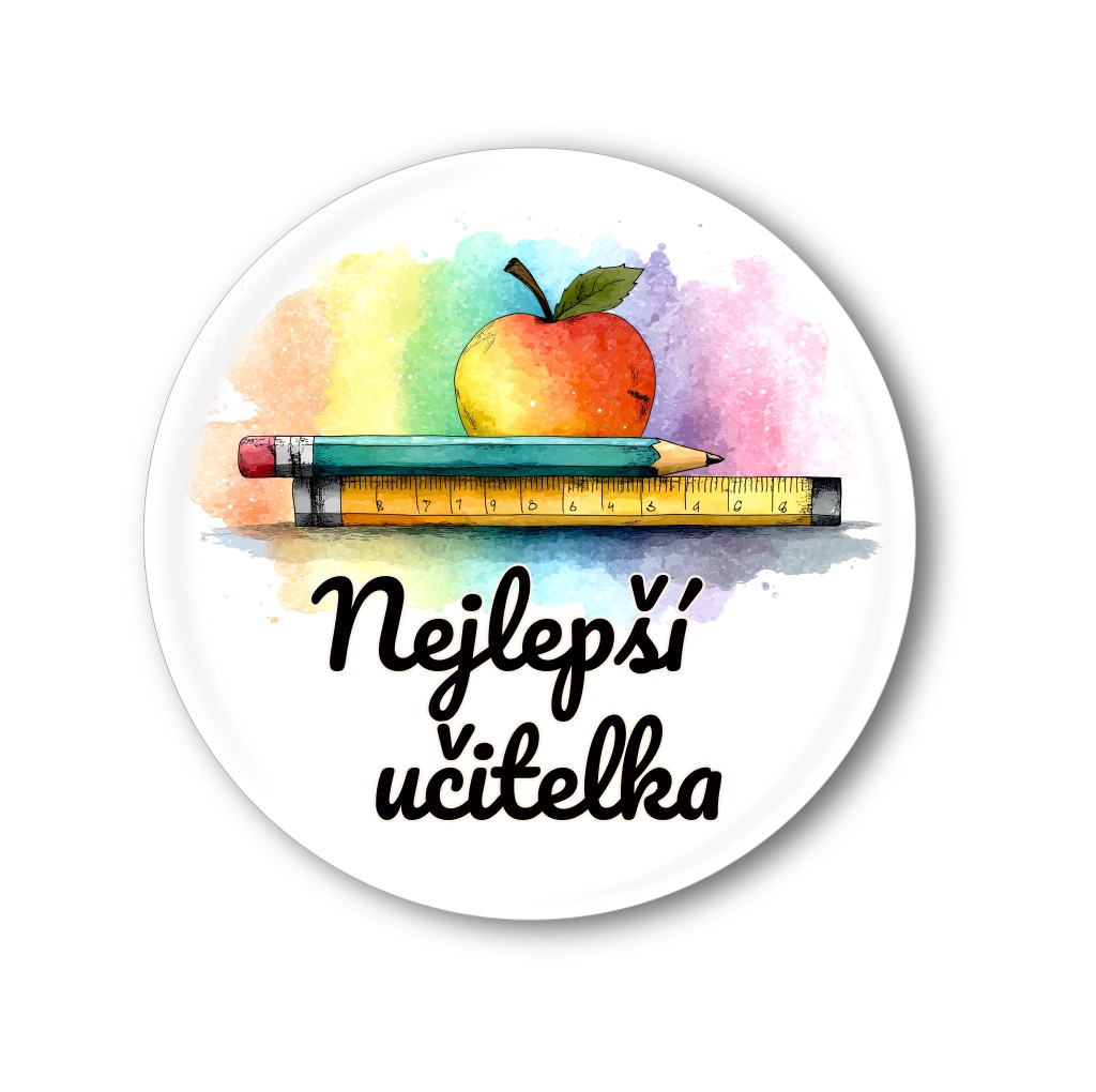 Překvapte svou učitelku originální připínací plackou s nápisem „Nejlepší učitelka“. Barevný motiv s akvarelovým pozadím a školními pomůckami – jablkem, tužkou a pravítkem – skvěle doladí každý dárek na konec školního roku nebo k jiné příležitosti. Placka je praktickým a milým poděkováním za celoroční snahu a péči, kterou učitelka svým žákům věnuje.