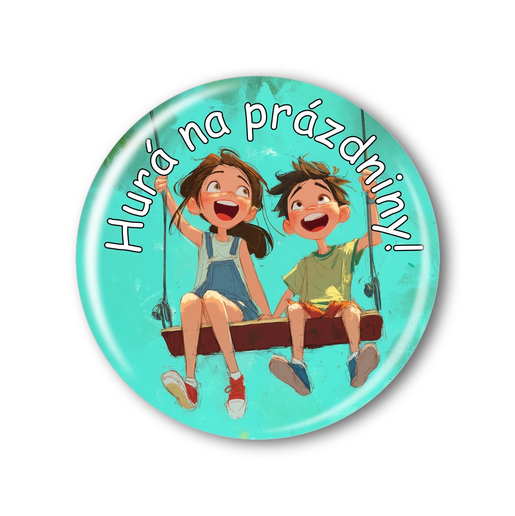 Veselá připínací placka s nápisem „Hurá na prázdniny!“ je ideálním dárkem pro žáky na konec školního roku. Barevný motiv dvou radostných dětí na houpačce skvěle vystihuje atmosféru blížících se letních prázdnin a nadšení ze zaslouženého volna. Placka potěší každého školáka jako malá odměna, krásná vzpomínka a stylový doplněk na batoh nebo oblečení.