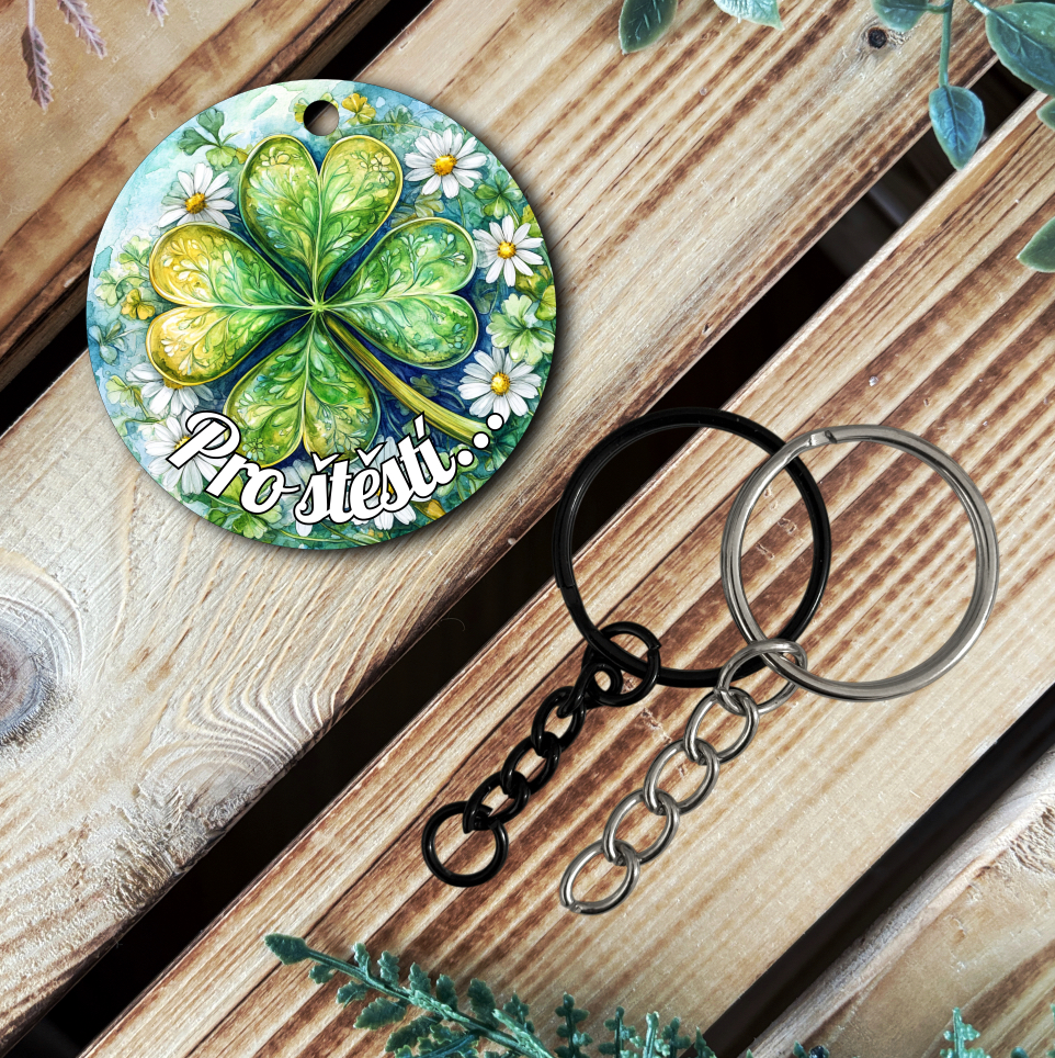 Přívěsek s motivem čtyřlístku, tradičního symbolu štěstí a pohody. Tento malovaný design zachycuje čtyřlístek v živých zelených odstínech s jemnými ornamentálními detaily uvnitř lístků. Motiv je zasazen do přírodní scenérie s rozkvetlými sedmikráskami na světle modrém pozadí, doplněný "Pro štěstí".
