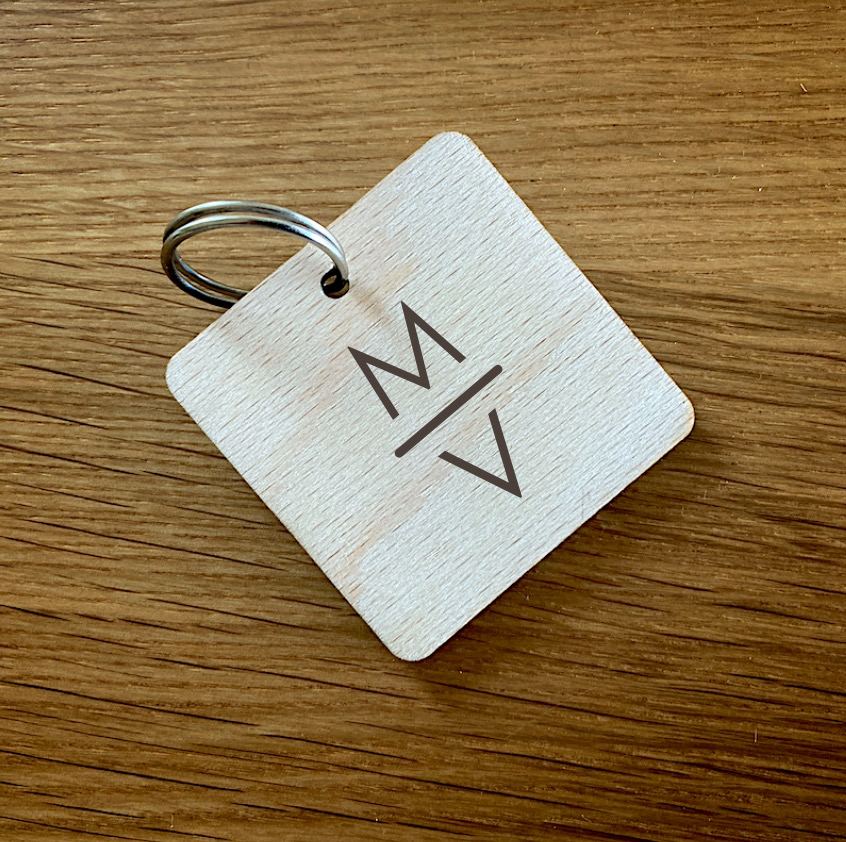 Dřevěný přívěsek na klíče s iniciály.