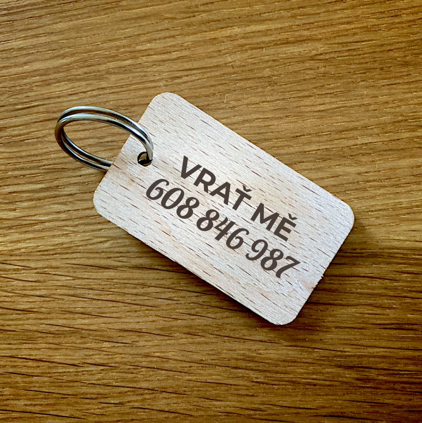 Dřevěný přívěsek na klíče se zakázkovým gravírováním.