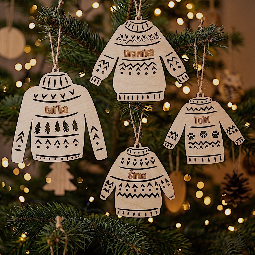 Připravte se na Vánoce s našimi unikátními dřevěnými vánočními ozdobami, které jsou personalizované vašimi jmény. Tyto kouzelné ozdoby v podobě svetříků dodají vašemu vánočnímu stromku osobitý a hřejivý nádech.