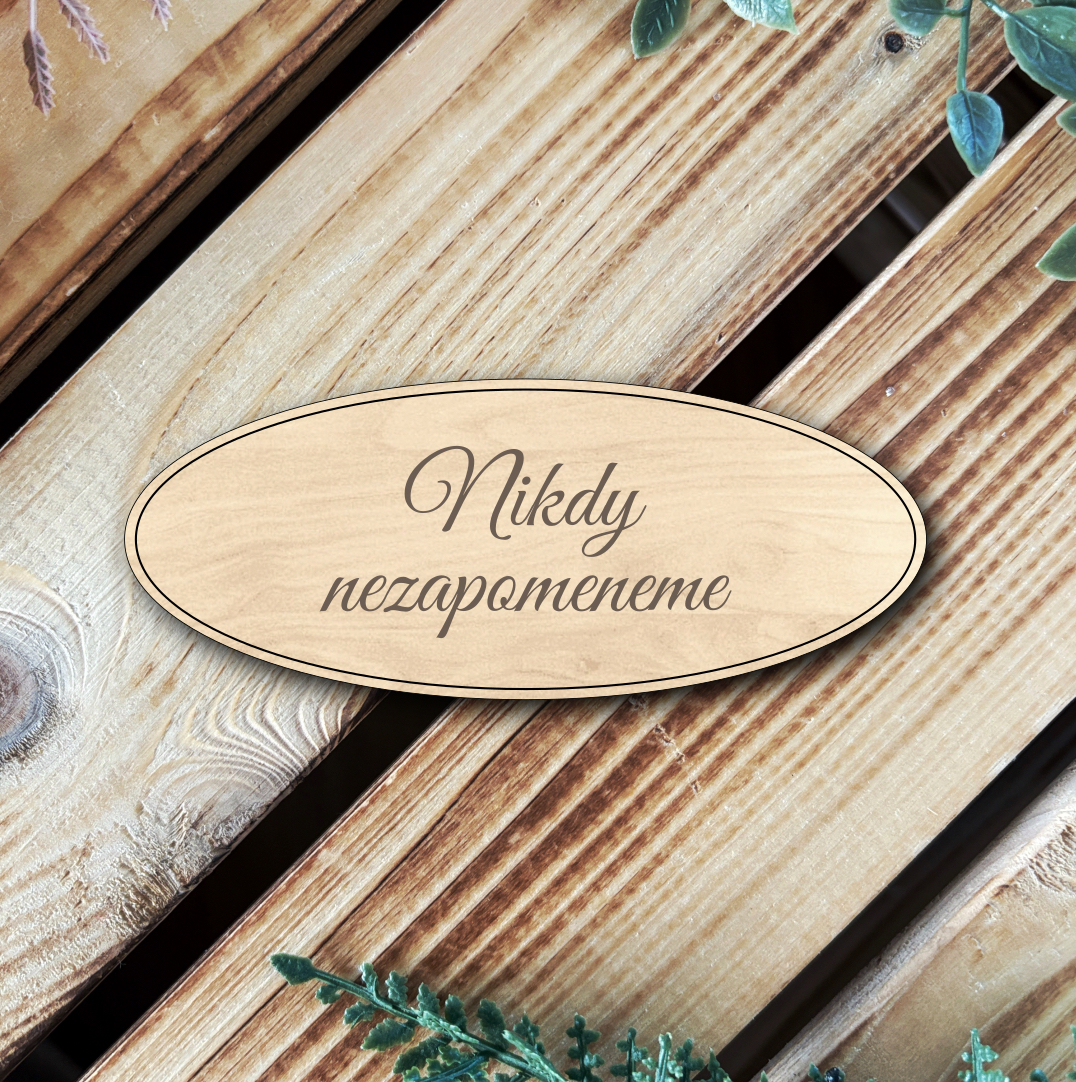 Cedulka má oválný tvar a decentní gravírovaný nápis s krásným fontem, jenž symbolizuje tichou vzpomínku a respekt. Díky preciznímu zpracování a jemnému dřevěnému tónu je ideální volbou pro ty, kdo hledají decentní a přírodní formu památky.