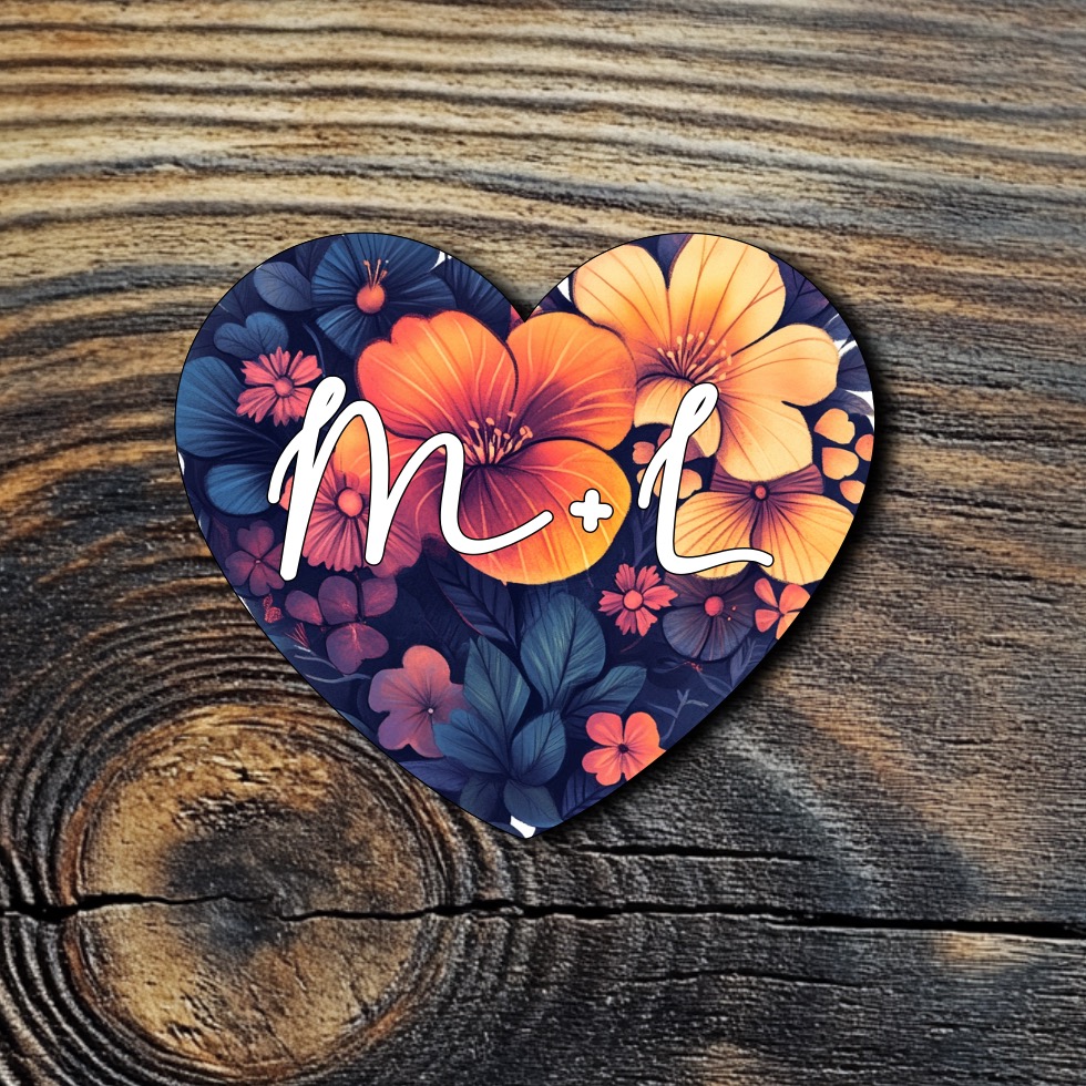 Svatební brož s iniciály je dokonalým symbolem lásky a harmonie, ideálním doplňkem nejen na svatební den. Elegantní brož ve tvaru srdce kombinuje živé květinové motivy v odstínech oranžové, růžové a tmavě modré s personalizovanými iniciály, které ji činí jedinečnou a osobní.