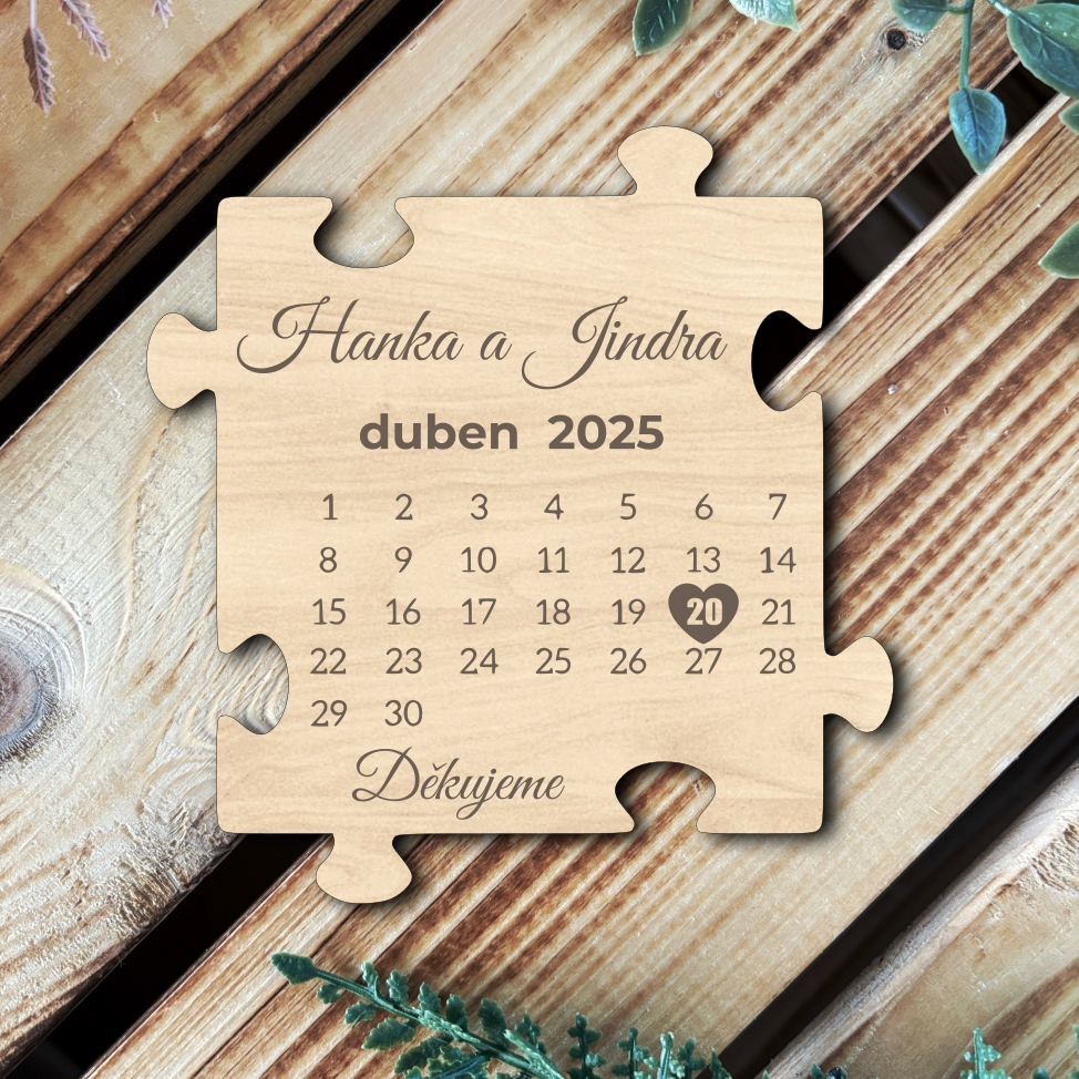 Svatební magnetka ve tvaru dílku puzzle je milá a osobní pozornost pro svatební hosty. Na magnetku doplníme vaše jména, měsíc a rok a kalendářní přehled, díky kterému si hosté snadno připomenou datum svatby. Vhodné jako „děkovná“ drobnost – působí decentně, romanticky a zároveň prakticky.