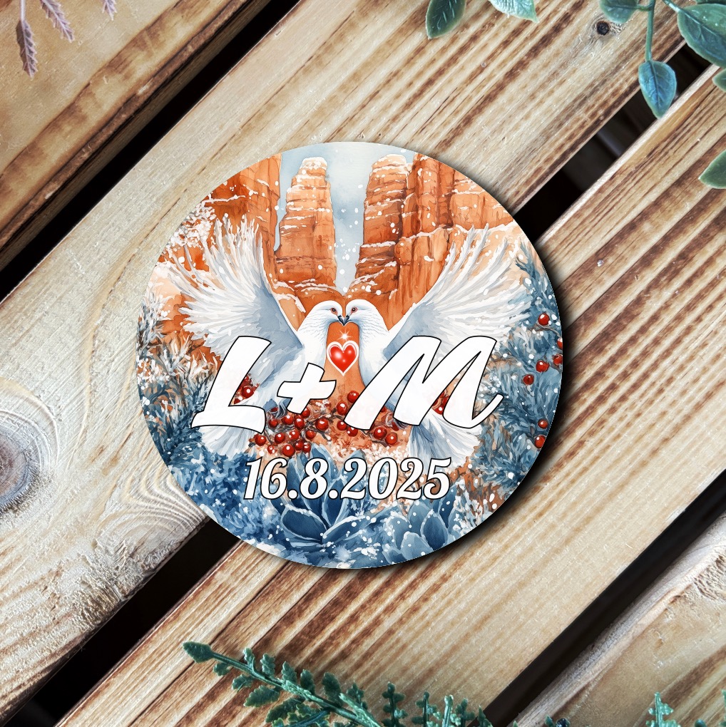 Barevné svatební magnetky s personalizovanými iniciály a datem svatby na přání jsou jedinečným způsobem, jak vytvořit trvalou památku na váš výjimečný den. Tento originální doplněk potěší vaše hosty svou praktičností i krásným provedením, ať už jako dárek na památku, nebo dekorace na lednici či jiný kovový povrch.