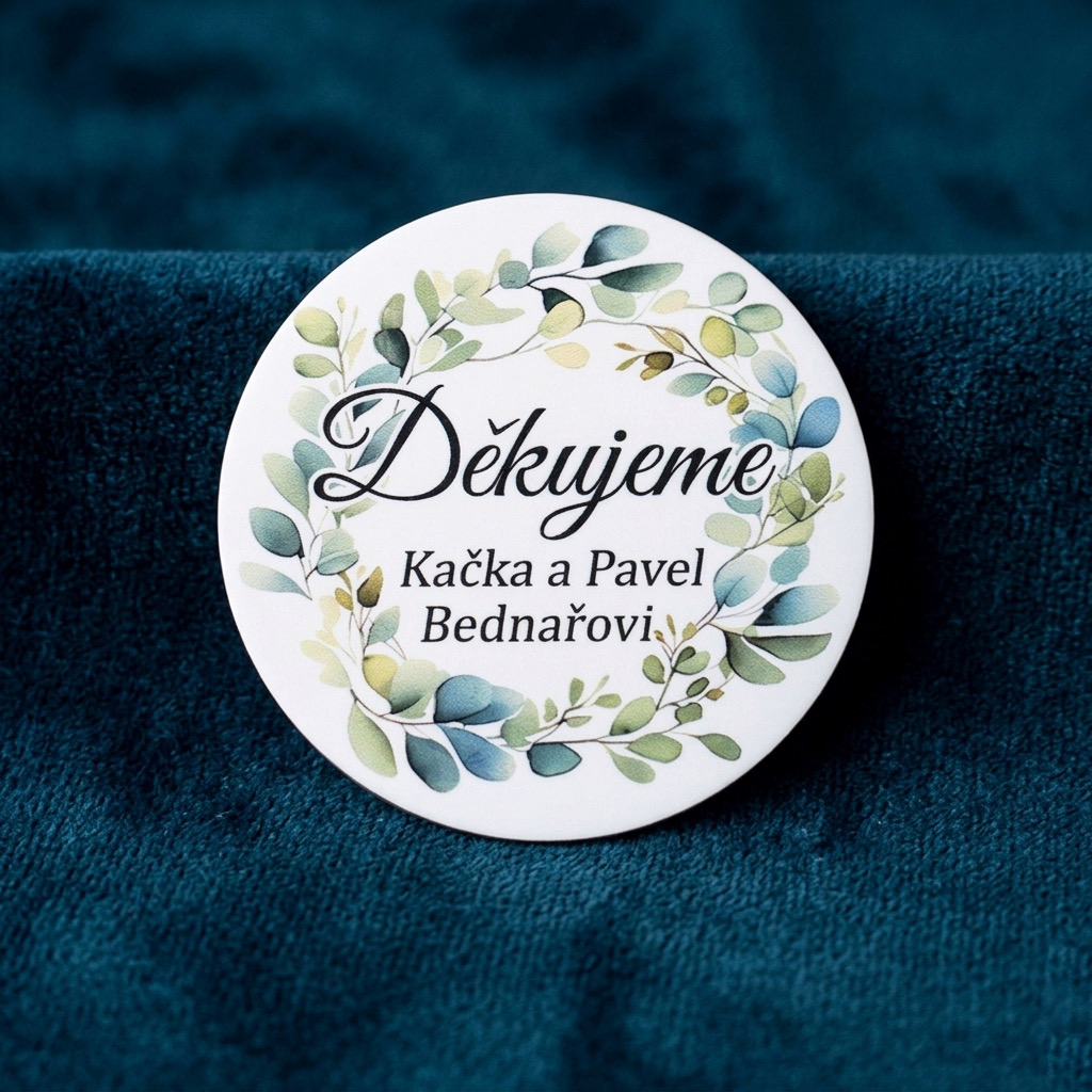 Tyto personalizované svatební magnetky jsou stylovým detailem, který doladí atmosféru vaší svatby. Jemný přírodní motiv s lístky působí romanticky a nadčasově, zatímco možnost úpravy textu vám umožní přidat jména novomanželů, datum svatby nebo krátké poděkování hostům. Magnetka slouží nejen jako dekorace, ale i jako milá památka, kterou si hosté odnesou domů.