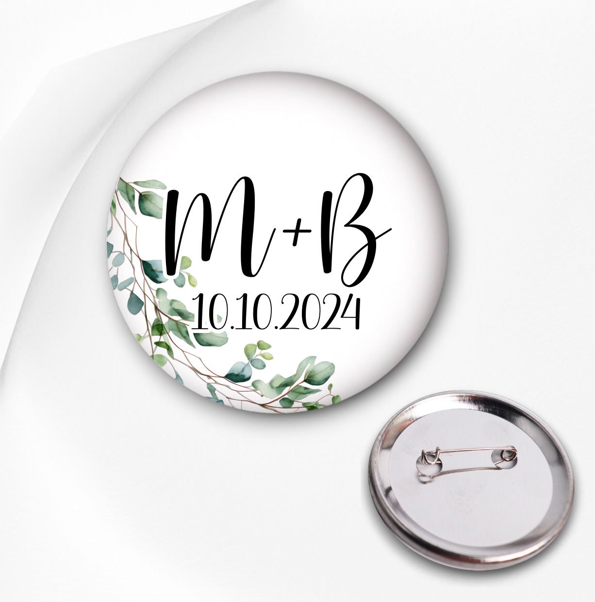 Placka o velikosti 44 mm nebo 58 mm na spínací špendlík. Přední strana je potažena lesklou průhlednou fólií, zezadu je spínací špendlík a jsou v celokovovém provedení.  Požadované iniciály a datum svatby nám prosím napište do poznámky v nákupním košíku.  celý popis