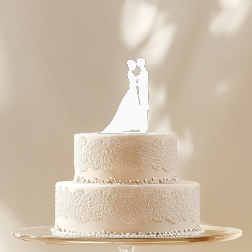 Svatební zápich z bílého plexiskla je jemná a elegantní dekorace, která dodá vašemu dortu romantický šmrnc a krásně podtrhne celkovou atmosféru svatebního dne. Motiv líbajícího se páru ženicha a nevěsty symbolizuje lásku a jedinečné spojení, čímž se zápich stává nádherným detailem na vašem dortu.