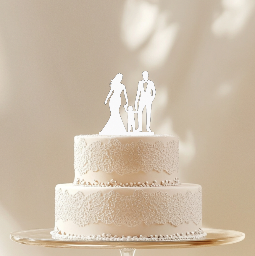 Svatební zápich z bílého plexiskla je jemnou a stylovou dekorací, která dodá vašemu dortu elegantní a romantický nádech. Motiv rodiny – nevěsty, ženicha a dítěte – symbolizuje lásku, jednotu a nový začátek. Tento zápich svou čistotou a minimalistickým designem krásně podtrhne slavnostní atmosféru svatebního dne.