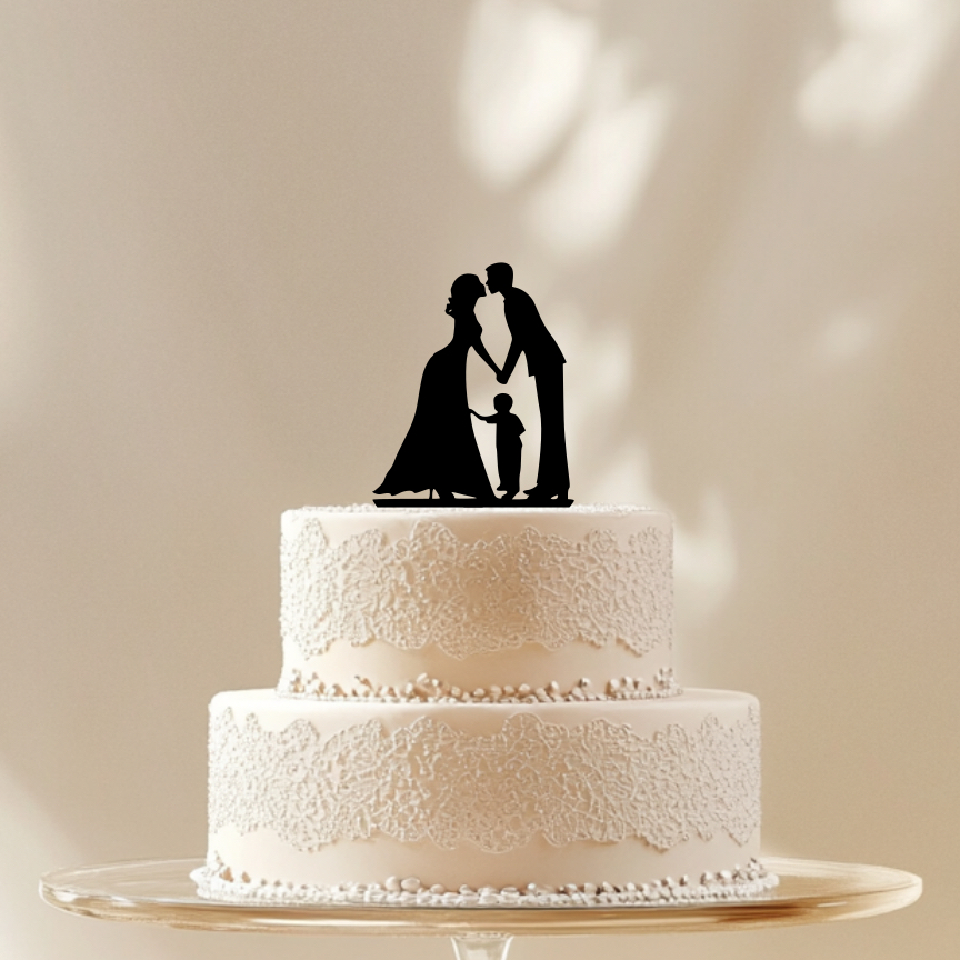 Svatební zápich z černého plexiskla je elegantní a moderní dekorace, která dodá vašemu svatebnímu dortu jedinečný a stylový vzhled. Motiv zahrnující ženicha, nevěstu a dítě symbolizuje lásku, jednotu a silné rodinné pouto.