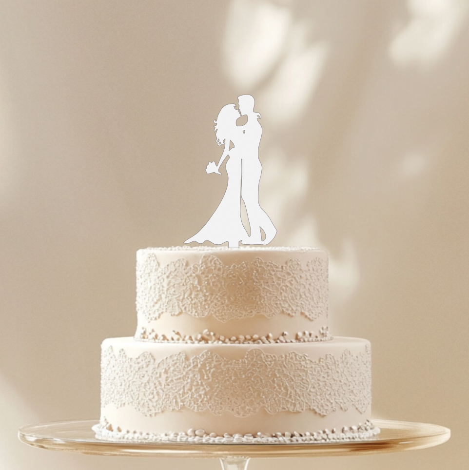 Svatební zápich do dortu z bílého mléčného plexiskla je stylová a elegantní dekorace, která dokonale ozdobí váš svatební dort a přidá mu luxusní vzhled. Zápich znázorňuje romantickou siluetu novomanželů zachycenou v jemném a detailním designu, který symbolicky vystihuje lásku a spojení nevěsty a ženicha.