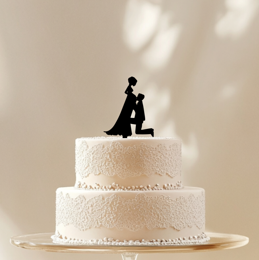 Svatební zápich z černého plexiskla s motivem těhotné nevěsty a klečícího ženicha je elegantní a emotivní dekorace na svatební dort, která přitahuje pozornost svou sofistikovaností a symbolickým významem. Jemná silueta vyřezaná z lesklého černého plexiskla perfektně kontrastuje se světlými krémy nebo zdobením dortu, čímž se stává jedinečnou dominantou svatební hostiny.