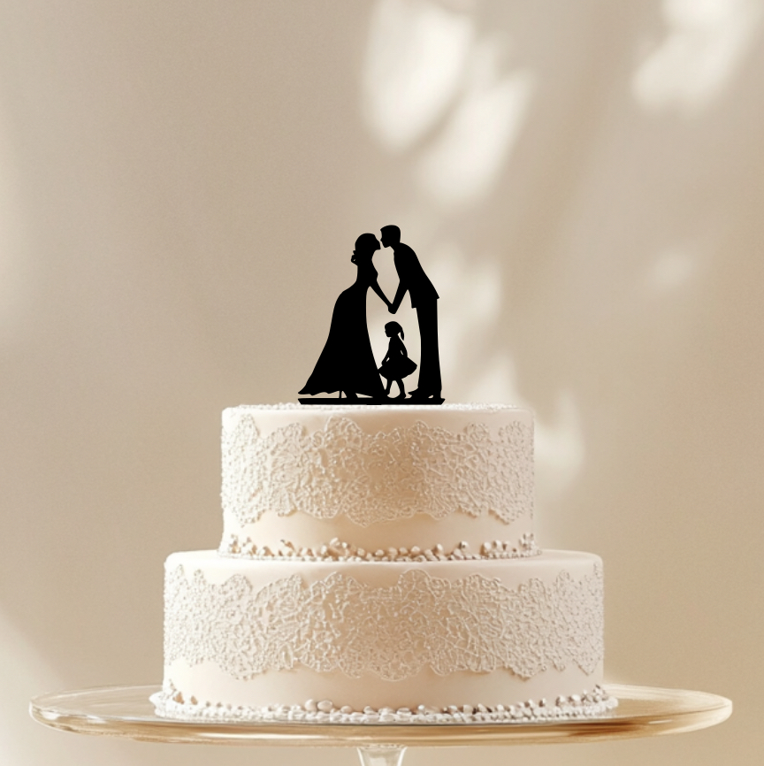 Svatební zápich z černého plexiskla s motivem šťastné rodiny – ženicha, nevěsty a jejich dítěte – je krásnou a osobitou dekorací, která na svatebním dortu vyjadřuje lásku a propojení rodiny. Stylizovaná silueta vyřezaná z lesklého černého plexiskla skvěle kontrastuje se světlými nebo pastelovými tóny dortu a dodává mu moderní nádech elegance.
