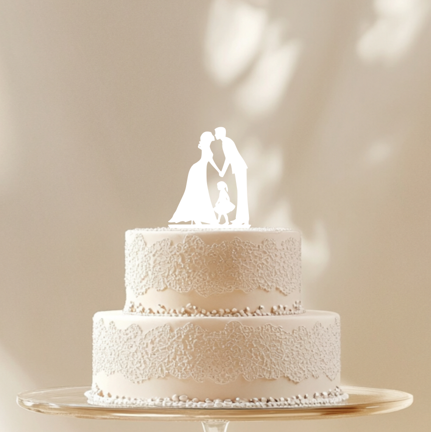 Svatební zápich z bílého plexiskla je jemnou a romantickou dekorací, která dokonale ozdobí váš svatební dort. Stylizovaný motiv šťastné rodiny – ženicha, nevěsty a dítěte – symbolizuje lásku, spojení a začátek společné životní cesty. Čistě bílý design je nadčasový a elegantní, takže se hodí ke svatbám tradičním i moderním.