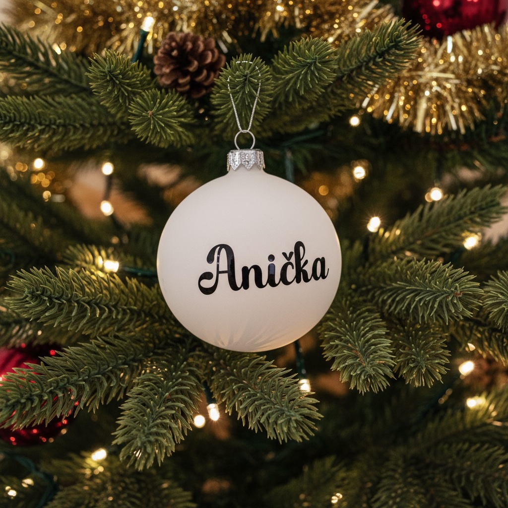 Objevte kouzlo vánoční dekorace s naší personalizovanou vánoční baňkou se jménem. Tato elegantní baňka z bílého matného skla s černým nápisem dodá vašemu stromečku výjimečný nádech a stane se skvělým dárkem pro vaše blízké.