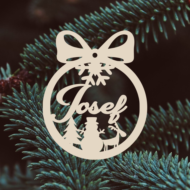 Dřevěná vánoční ozdoba na stromeček s vyřezaným jménem Josef.