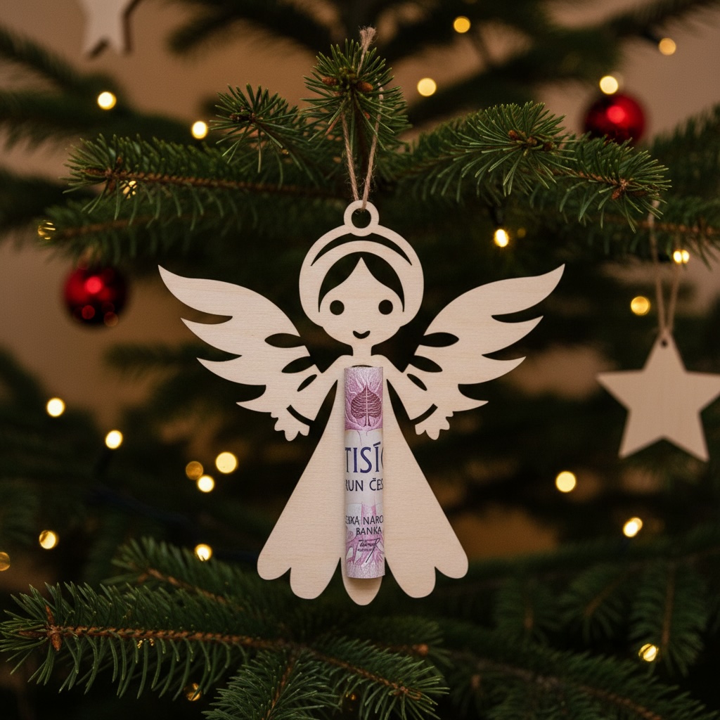 Dřevěná vánoční ozdoba jako originální způsob darování peněz.