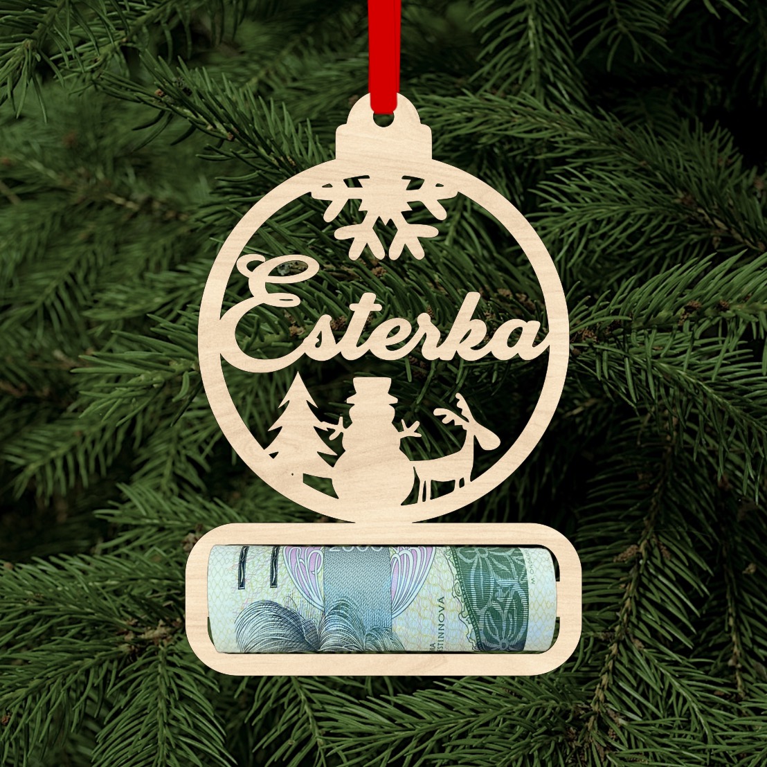 Hledáte způsob, jak letos o Vánocích darovat peníze stylově a originálně? Dřevěná vánoční ozdoba se jménem na přání je perfektním řešením! Tento jedinečný kousek kombinuje krásný design vánoční dekorace s praktickým využitím pomocí klipu na vložení bankovky, udělá z klasického daru peněz i hezký zážitek. Jméno dodá ozdobě osobní dotek a stane se tak nejen krásnou vzpomínkou na Vánoce, ale také ozdobou, kterou lze každý rok na stromečku znovu použít.