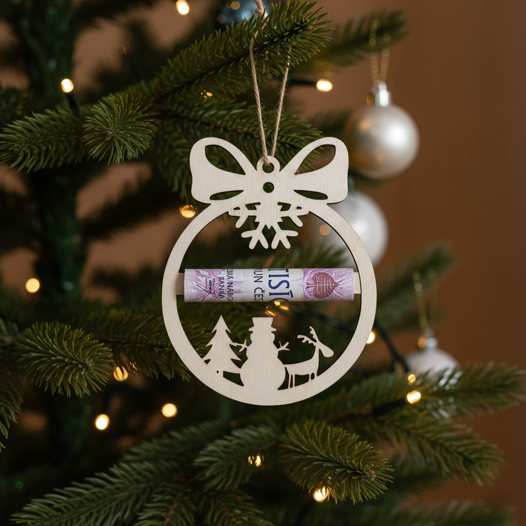 Hledáte způsob, jak letos o Vánocích darovat peníze stylově a originálně? Dřevěná vánoční ozdoba je perfektním řešením! Tento jedinečný kousek kombinuje krásný design vánoční dekorace s praktickým využitím pomocí klipu na vložení bankovky, udělá z klasického daru peněz i hezký zážitek.