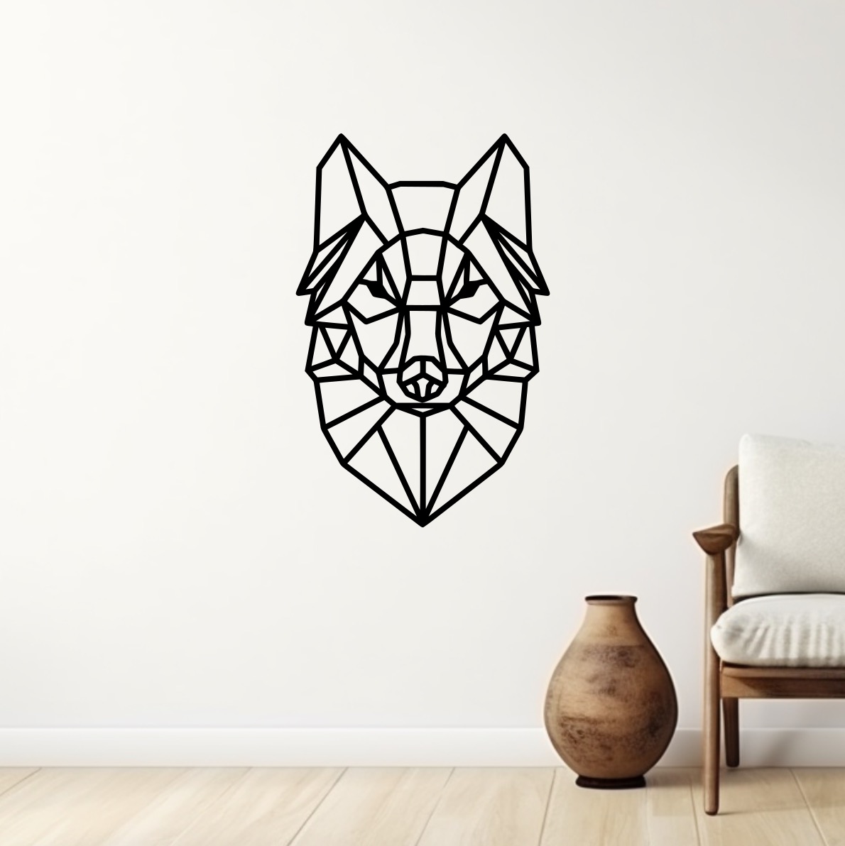 Dřevěná dekorace na stěnu - geometrická hlava vlka.   Materiál: Dřevovláknitá deska HDF o síle 3 mmBarva: natural hnědá, nebo černáVelikost: malá = 31 x 50 cm, velká = 45 x 70 cmMožnosti připevnění: zavěšení nebo připelepí celý popis