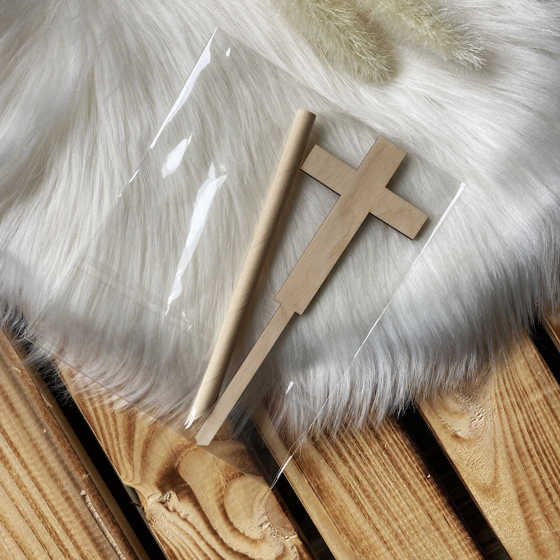 Ozdobný dřevěný zápich do dortu s motivem kříže, vhodný například na křtiny.