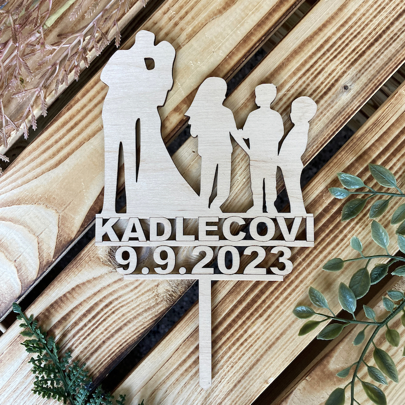 Ozdobný dřevěný zápich do dortu se svatebním motivem a společným příjmením, díky kterému i z obyčejného dortu vytvoříte dort jedinečný, který bude každý obdivovat.