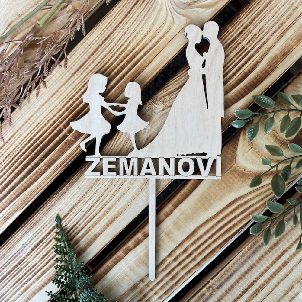 Dřevěný zápich do dortu se svatebním motivem a společným příjmením, díky kterému i z obyčejného dortu vytvoříte dort jedinečný, který bude každý obdivovat.