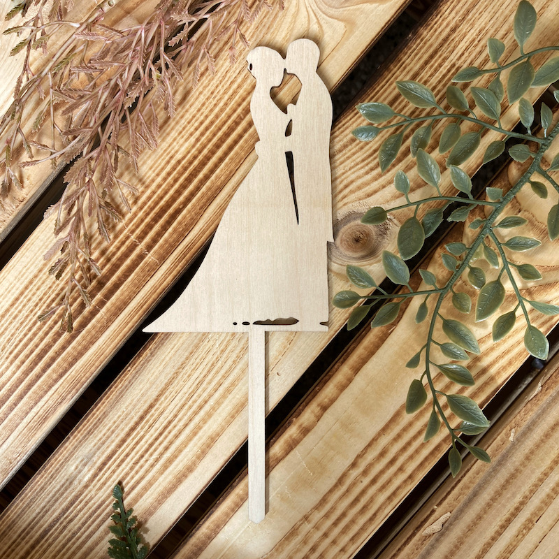 Ozdobný dřevěný zápich do dortu s motivem novomanželů, díky kterému i z obyčejného dortu vytvoříte dort jedinečný, který bude každý obdivovat.