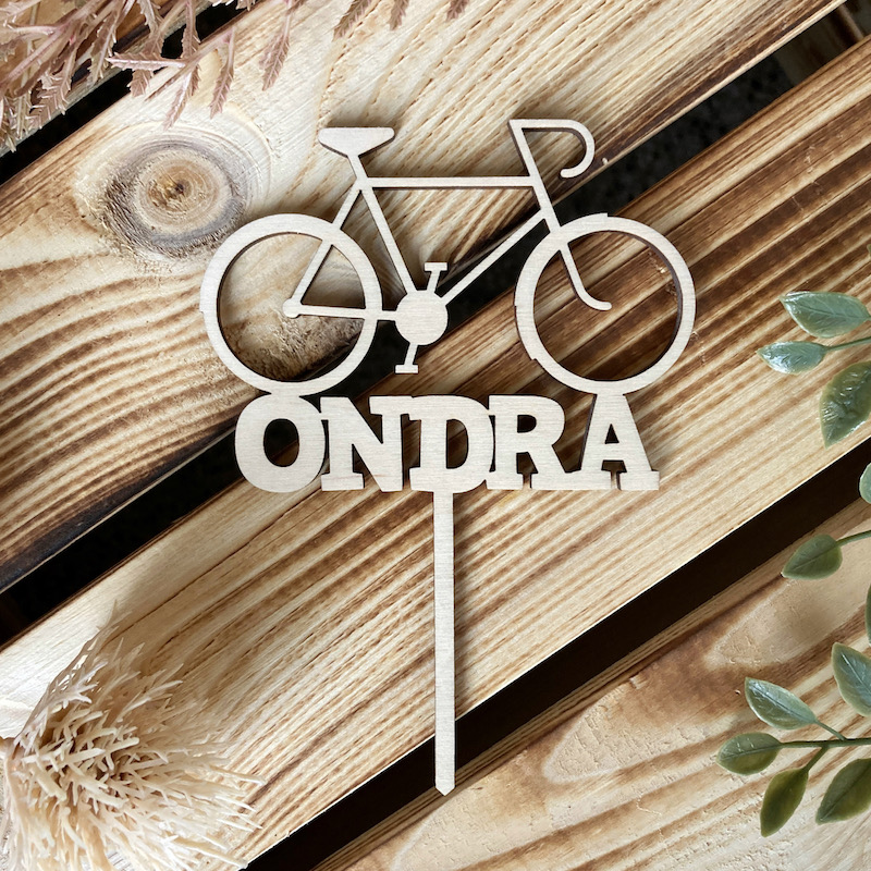 Ozdobný dřevěný zápich do dortu s motivem bicyklu a jménem oslavence, díky kterému i z obyčejného dortu vytvoříte dort jedinečný, který bude každý obdivovat.