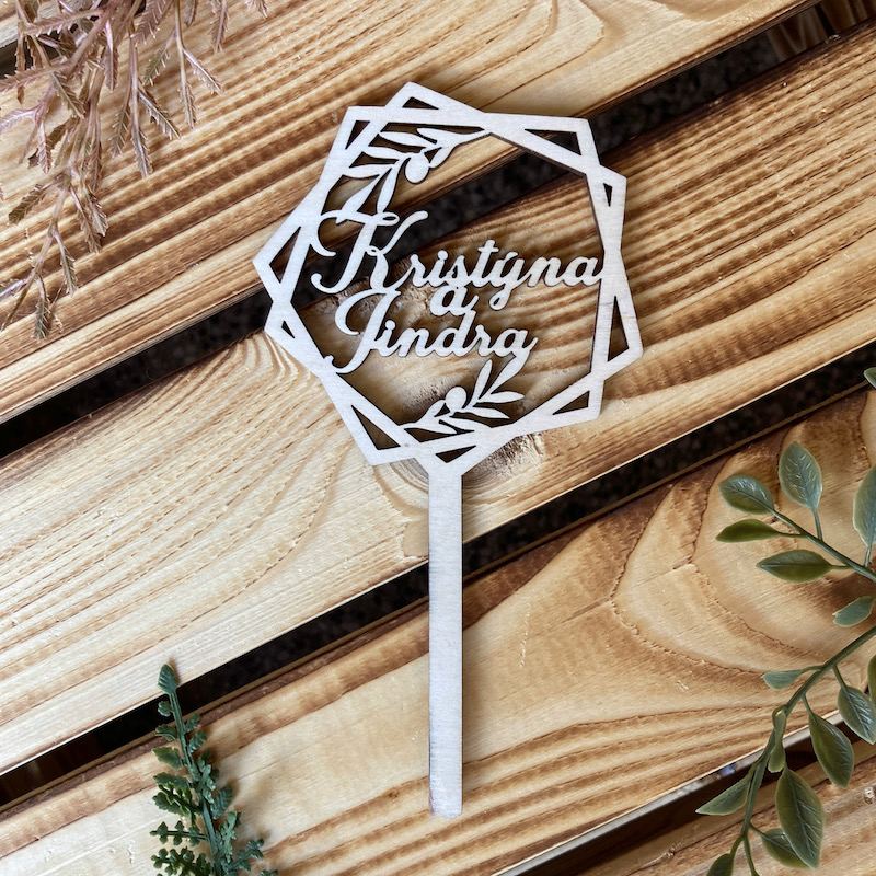 Dřevěný zápich do dortu se svatebním motivem se jmény novomanželů, díky kterému i z obyčejného dortu vytvoříte dort jedinečný, který bude každý obdivovat.